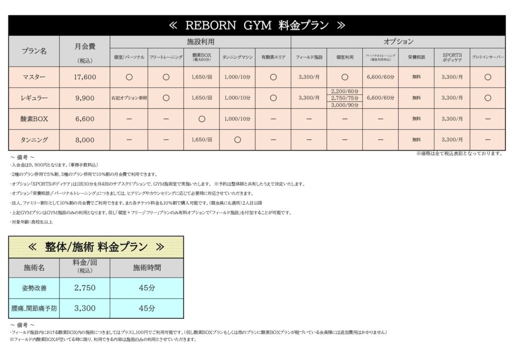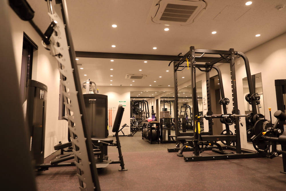 REBORNのGYMは、個室トレーニングルーム(2部屋)をはじめ、酸素ボックス、タンニングマシン、ラウンジなど、多彩な設備を備えています。